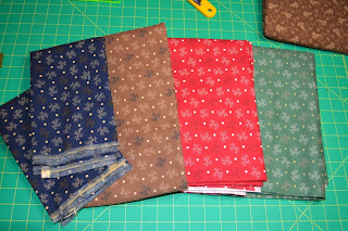 I bought that green fabric when looking for greens that were not “poison green” at Little Quilts a couple of months ago. Hmm, that pattern sure looked familiar. It seems that when I find a good thing I keep going back for more. I bought the blue when I wanted to do a blue and brown quilt for my son but it just wasn’t right with the brown. Then I saw a basket pattern by Linda Sawrey at Temecula and was thrilled I had many yards of that blue. The brown was a trial run for my Lemoyne stars but didn’t work for that. It will, however, be going into another project. The red is a lovely cherry red – not too orange – and the green, well that works so well in red and green quilts. These are nice subtle but not boring prints and the colors are fantastic. They are from the “Tavern” lines (Tavern Blues, Tavern Reds – get the picture?) by Paula Barnes for Marcus Fabrics.