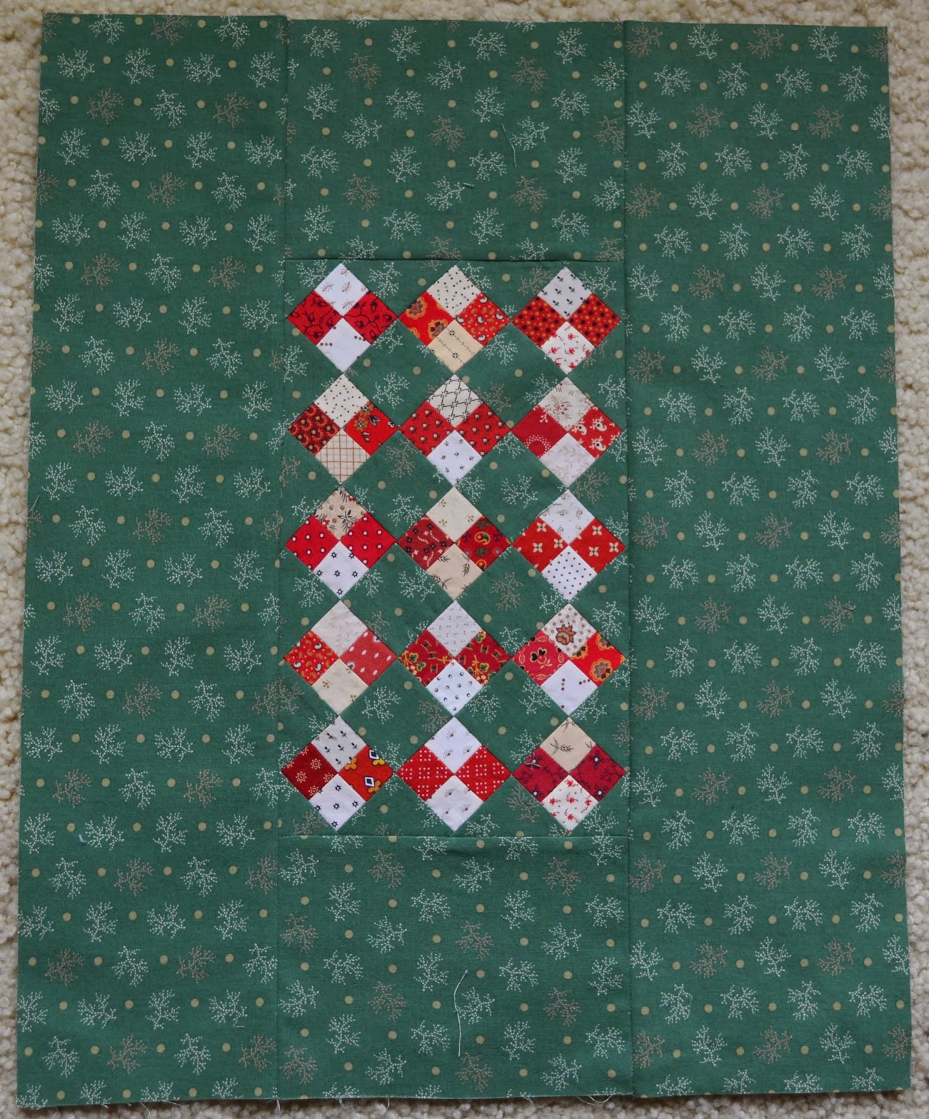 Since I finished two entire “quilts” I decided it was new project time. Cheri Payne’s design style is so inspiring and she provides some free patterns on her blog from time to time (I also bought plenty of her patterns, too). This little 4-patch was posted in June 2011. Cheri did hers with a black background and scrappy 4-patches. When I saw it I immediately thought “red and green!” It’s an easy quilt with easy directions but making those little 1-1/2″ 4-patches is kind of time consuming. But it’s so fun to dig around in the scrap box and fabric stash.