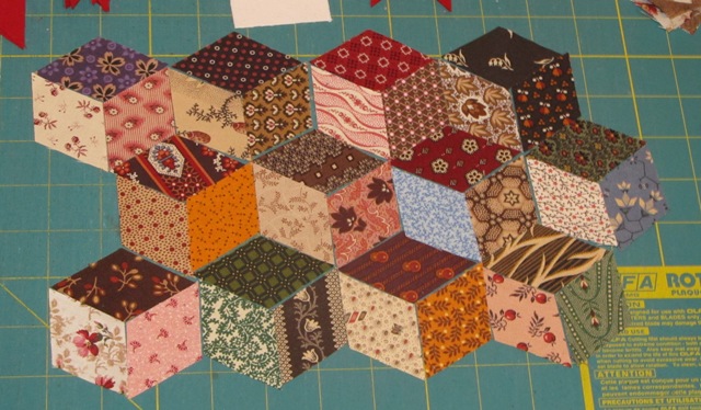 Love the tumbling blocks in those repro fabrics, but I have to say, I get a sense of foreboding about the way you talk about needing a hand sewing project soon. Hope all is well.