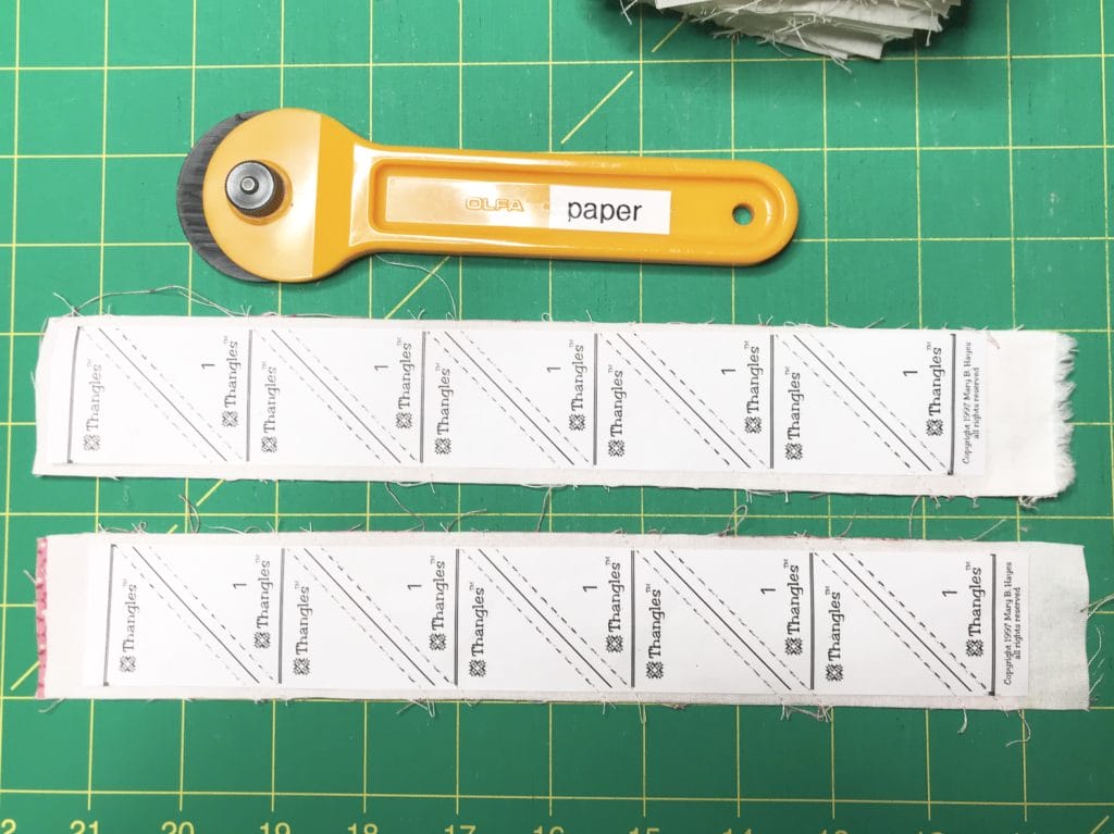 This is the next important hint…but let me start with a question. Do you let your fabric scissors touch paper? I didn’t think so. It follows logically that you would not want your fabric rotary cutter touching paper either. I have dedicated a separate rotary cutter for cutting up the sewn Thangles strips (and other paper, as needed). I even went to the store to buy a label maker just so that I could put the word PAPER on my designated rotary cutter. Actually, the label maker was to put my husband’s name and phone number on his glasses case since he has a habit of losing them pretty much every time he leaves the house. But…it has other uses. When my fabric rotary cutter blade gets dull I demote it to the paper rotary cutter and put the new blade to work on fabric. For those like me who just feel like they are throwing away money when you change a blade (until you cut fabric with a new blade and ask yourself “why did I wait so long?”) this is a way to feel better because you’re still using that old blade.